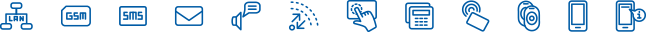 - mobilní GSM/GPRS (přenos na monitorovací stanici, hlasové / SMS zprávy, dálkové ovládání SMS / hlasové menu, mobilní aplikace, dálkové programování)