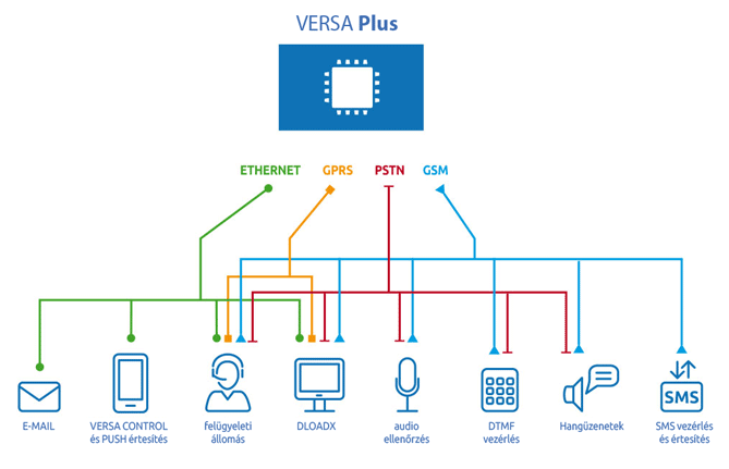 VERSA Plus kombinuje v sobě vlastnosti několika samostatných zařízení. Na základní desce ústředny jsou integrovány moduly: Ethernet, mobilní GSM/GPRS, PSTN komunikátor, hlasový a akustický verifikační modul. Výsledkem je zabezpečovací ústředna VERSA Plus, která může komunikovat přes tři nezávislé kanály (Ethernet, PSTN, GSM/GPRS), a tím zaručuje efektivní přenos informací.