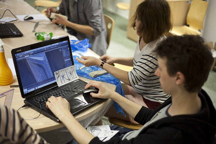 Tuż po części teoretycznej uczestnicy przeszli do części warsztatowej, która polegała na zaprojektowaniu pokrywy do Interkomu z wykorzystaniem gotowych elementów podstawy. Ćwiczenie to było nie lada wyzwaniem gdyż obfitowało w liczne ograniczenia technologiczne. Z dumą możemy powiedzieć, że młodzi designerzy z zacięciem podeszli do realizowania postawionego wyzwania.